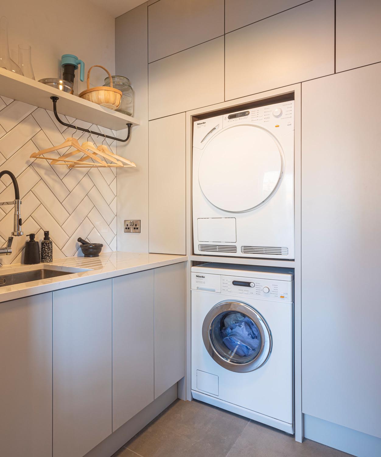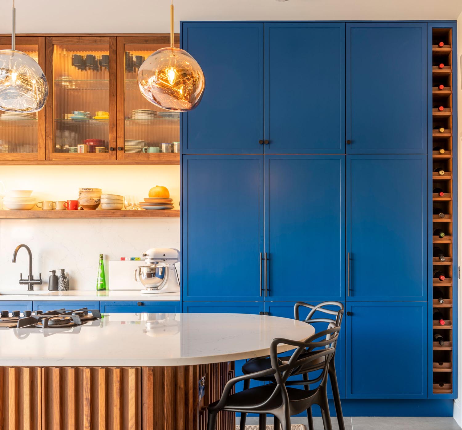 This mid century modern style kitchen is one of our absolute favourite projects we’ve had the pleasure of working on. It combine’s classic shaker style with a modern twist of the thin frames. As well as including some pieces from a couple of our favourite designer’s such as Tom Dixon and Philippe Stark, this wonderful kitchen includes a tablet shaped walnut island with secret cupboards.