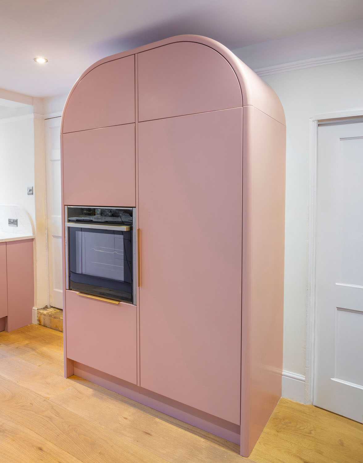 The standout feature, a freestanding curved oven unit, combines functionality with design flair, making it not just an appliance, but a statement piece in its own right.